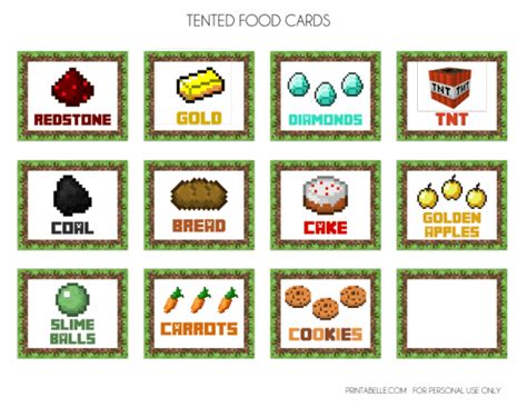 Printable Minecraft Food Labels perfect for your Minecraft Party! 32 food items included in these Printable Minecraft Food Tent Cards PLUS Editable The food labels: I borrowed these food label tents from a friend but you can print out your own free ones online. You can also create your own by...